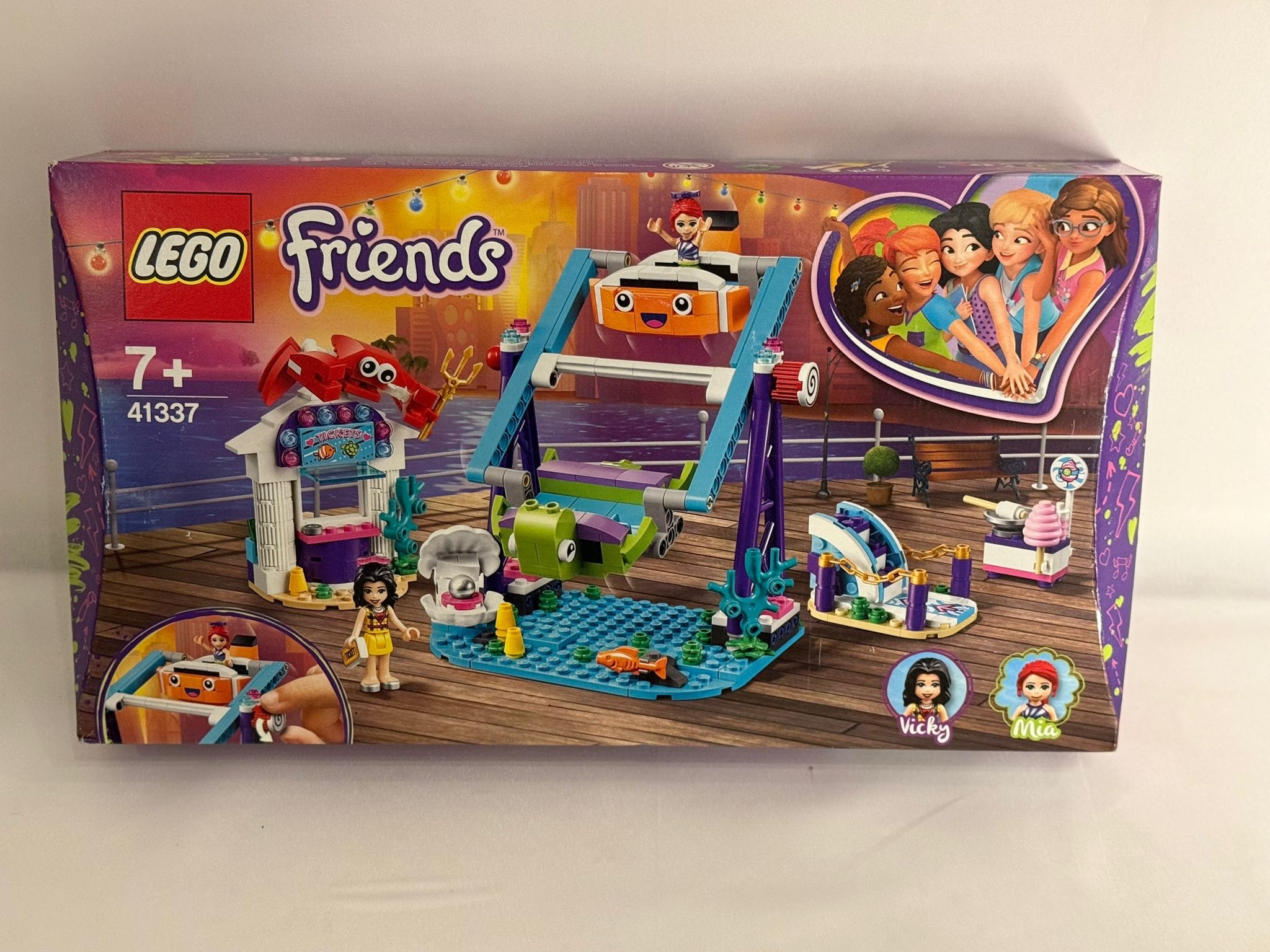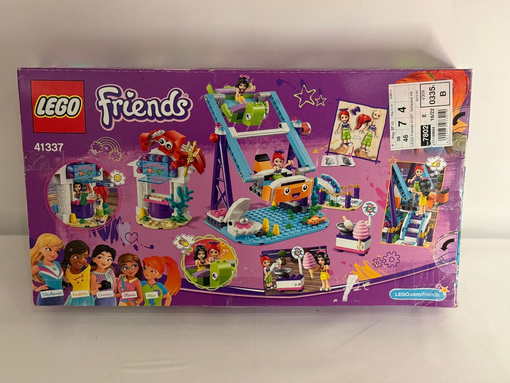 Verbringe eine schöne Zeit auf dem Jahrmarkt – mit dem LEGO® Friends Set „Schaukel mit Looping im Vergnügungspark“ (41337). Realistische Merkmale wie der Fahrkartenschalter, an dem mit Geldschein- oder Münzelementen bezahlt werden kann, schaffen eine Atmosphäre wie im Vergnügungspark. Wenn du den Knopf drehst, setzen sich die Gondeln mit Platz für je 3 LEGO Spielfiguren in Bewegung. Der Zuckerwattestand sorgt für zusätzliches Spielvergnügen. Stell dir nur einmal vor, wie viel Spaß es macht, die klebrige, rosa Köstlichkeit herzustellen. Auf dem Fahrkartenschalter dieses LEGO Fahrgeschäfts mit Meeresoptik thront eine riesige Krabbe und die Gondeln haben die Form von einer Schildkröte und einem Fisch. Damit ist es ein schönes Ausstellungsstück für jedes Kinderzimmer. Das Spielset enthält 2 Spielfiguren: LEGO Friends Mia und LEGO Friends Vicky.